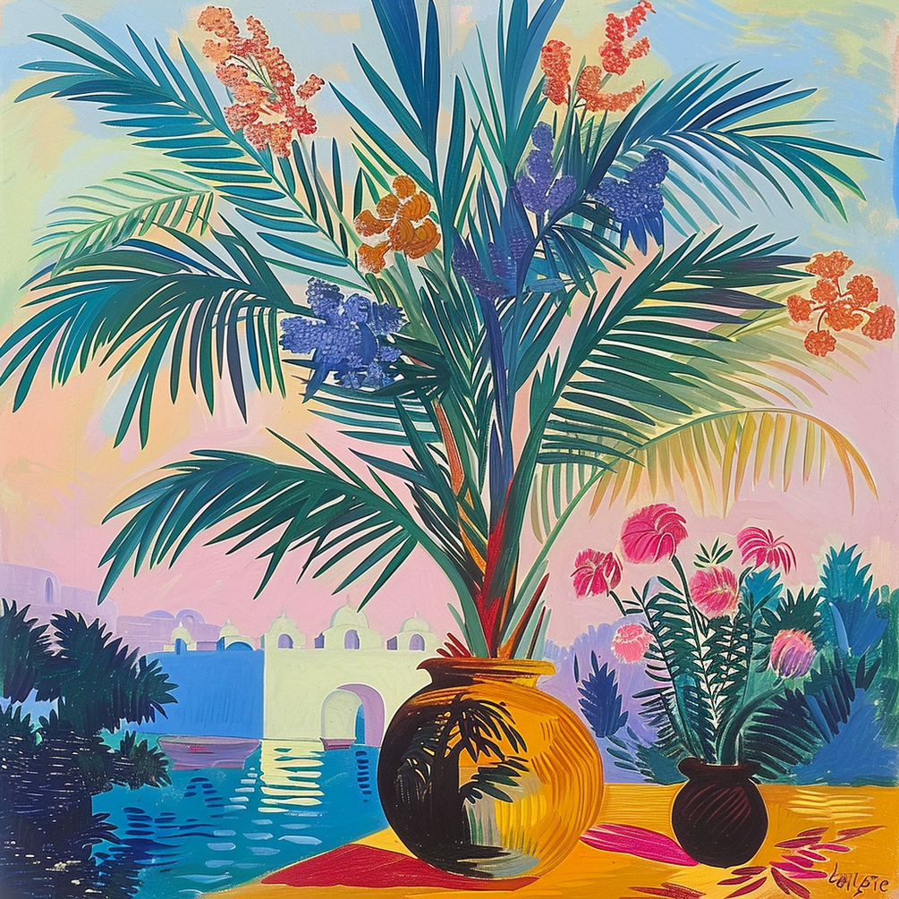 Plantes Tropicales Méditerranéennes / 🌴 TROPICAL MEDITERRANEAN GARDEN - Digital Art Print A vibrant tropical garden with lush plants, golden sunset light, and Mediterranean architecture. This colorful artwork brings warmth and nature into your home.